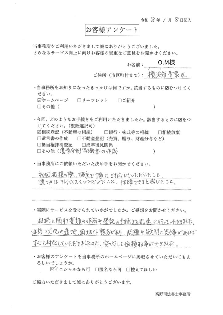 O.M様、この度は相続登記および遺産分割協議書の作成をご依頼いただき、誠にありがとうございました。