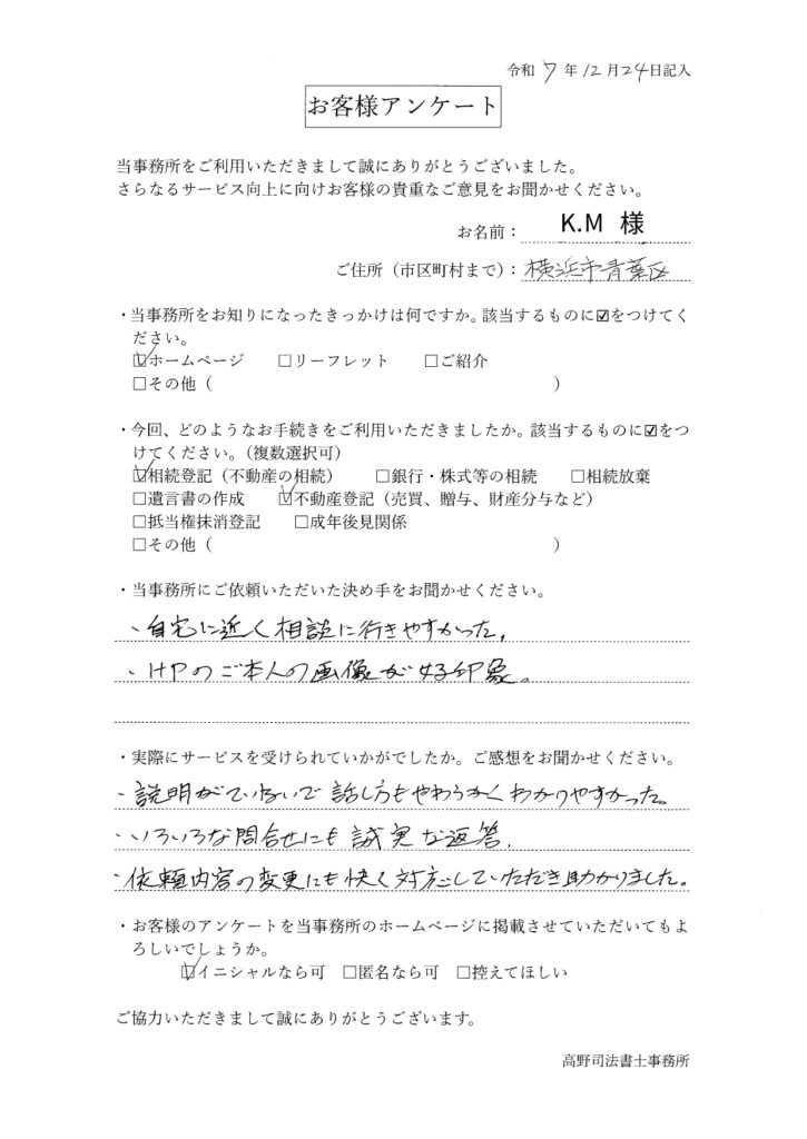 K.M様、この度は相続登記および不動産登記のご相談をいただき、誠にありがとうございました。