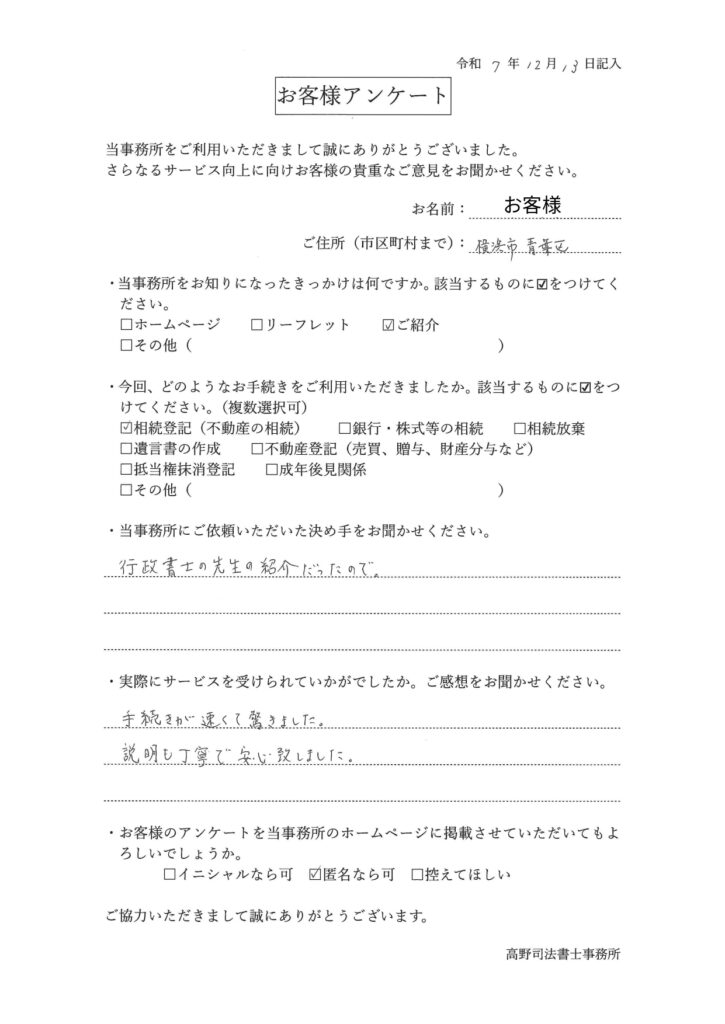 相続の手続きは複雑で不安を感じる方も多いですが、F.K様に「迅速な対応で信頼感があった」と感じていただけたことは、司法書士として何よりの励みになります 。