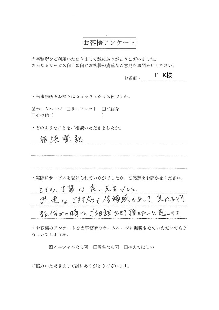 F.K様、この度は当事務所に相続登記のご相談をいただき、誠にありがとうございました 。 また、大変温かいメッセージをお寄せいただき、心より感謝申し上げます 。